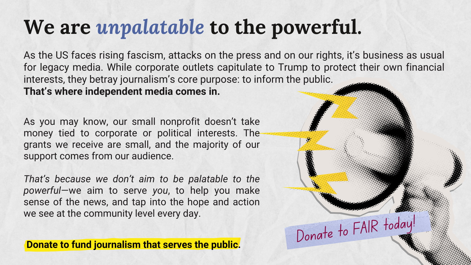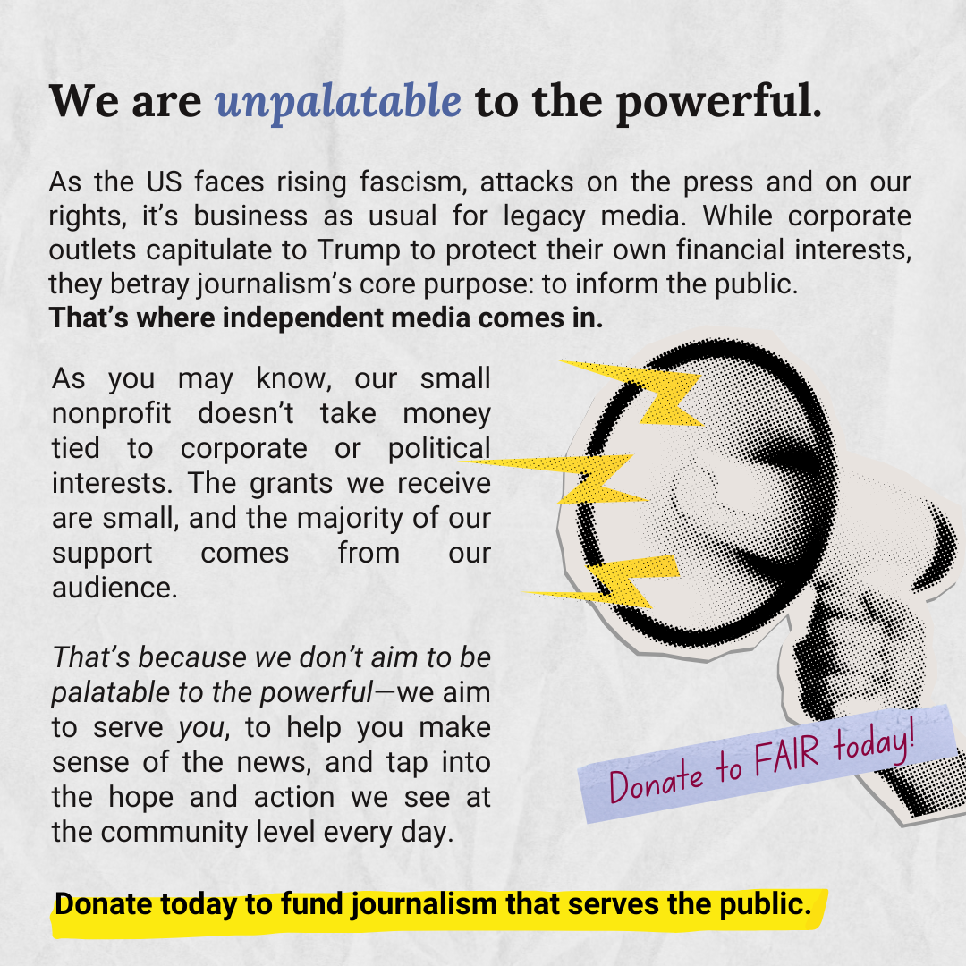 FAIR’s 4-page, ad-free, newsletter publishes ten times a year bringing you the media analysis and activism that you won’t find anywhere else. Choose a print subscription, a digital PDF edition, or both together.